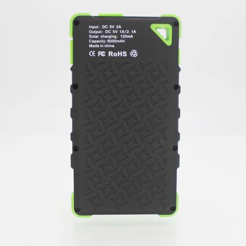built-in full 8000mAh lithium polymer battery which charges via a powerful 1.2W mono-crystalline solar panel