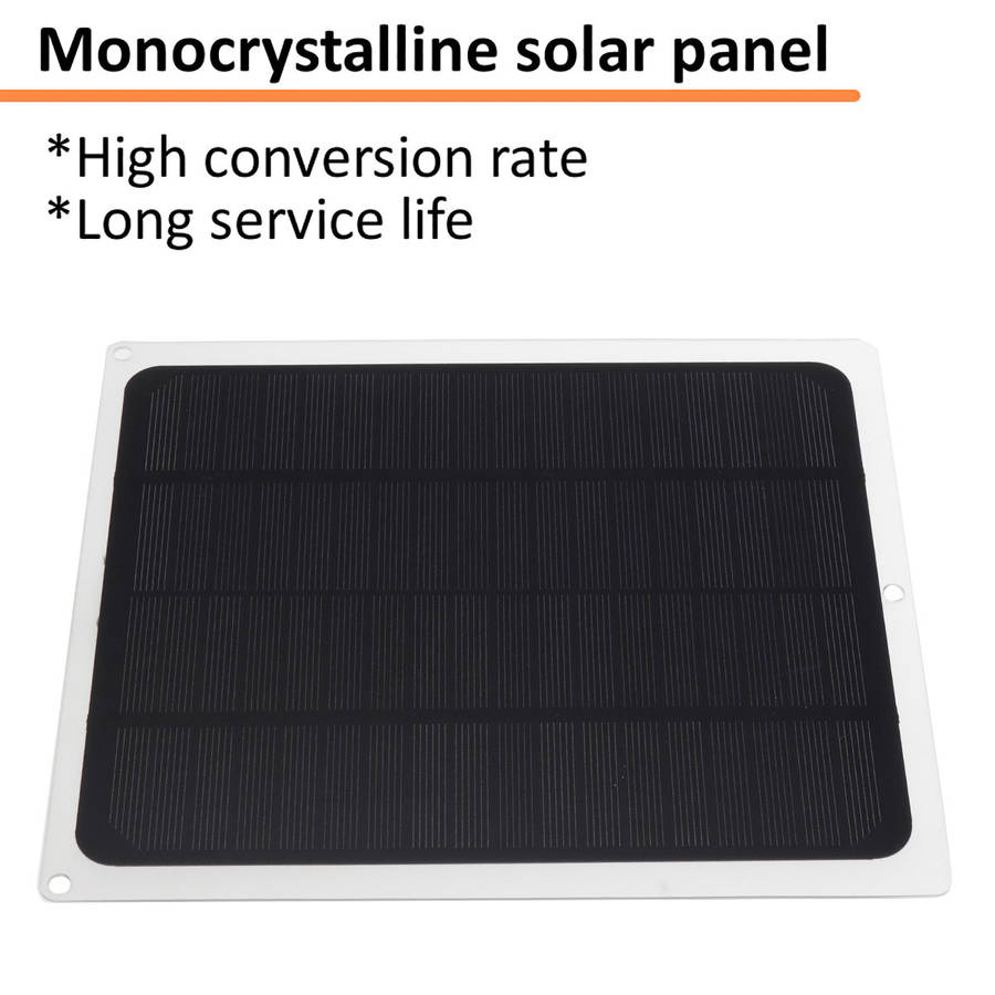 Material: Monocrystalline silicon + ABS Current: 800mA Interface output: USB + DC Power: 55W Working current: 0.83A Working voltage: 5V DC Output: 12-18V Open circuit voltage: 21V Short circuit current: 2.5A Solar panel size: 210 x 175mm/8.3 x 6.9in Fan size: 110 x 110mm/4.3 x 4.3in