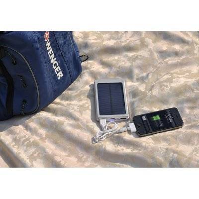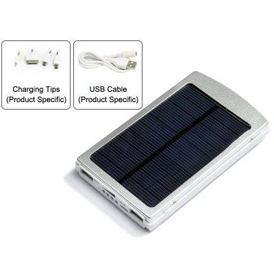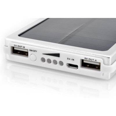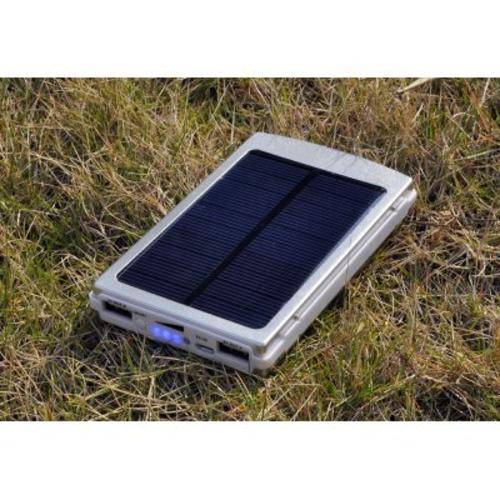 Solar Power Bank with 10000mAh built-in battery and 2 USB ports.