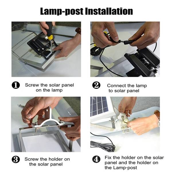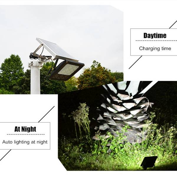 Operation: 1. Turn on the switch before use. The lamp connect solar panel into auto lighting controller condition. 2. During the day the lamp auto turn off, and solar panel absorb power stock electrical into battery. At night it auto turn on. 3. Solar panels need direct sunlight when charging. 4. When the solar panel is charging, should avoid shadows.