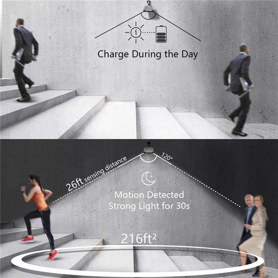 PIR MOTION SENSOR: This solar security lights sensing range of 10 to 26 feet (3 meters to 8 meters) with a 120 degree sensing angle.Turn on at night when motion sensor detected, last for 30 seconds and automatically restore after motion stops. No worry to turn off manually.
