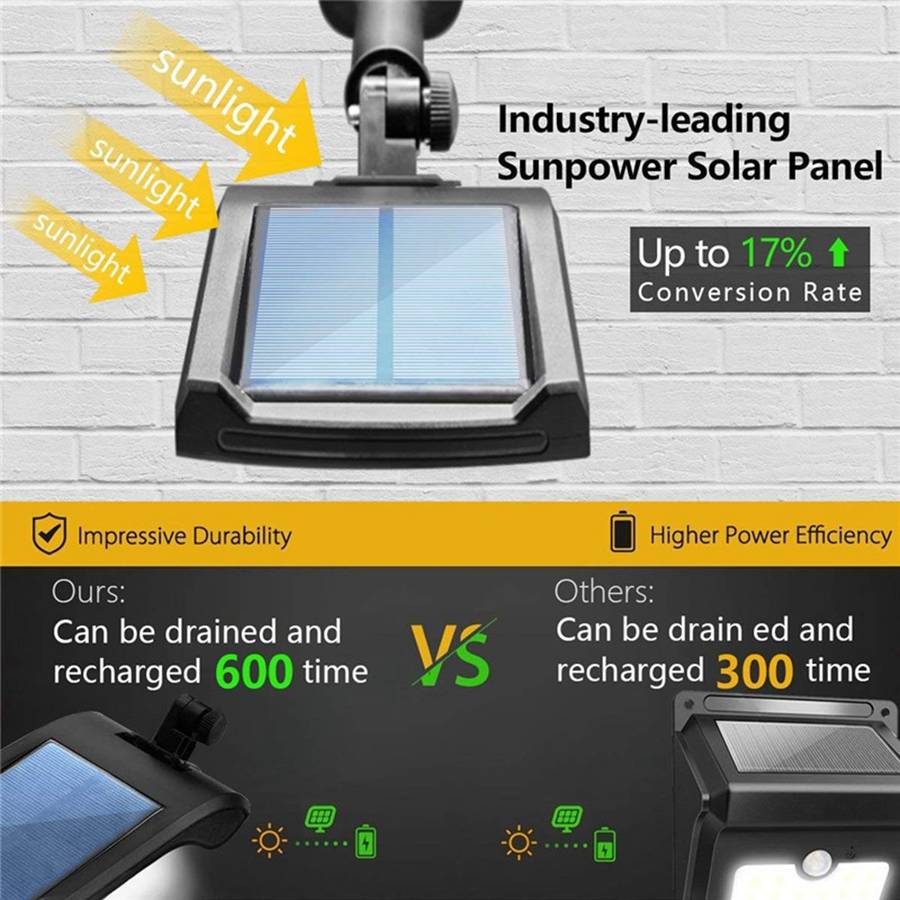 A new generation of 36 improved LED lights offers a larger coverage of luminosity. Much Brighter than other brands LED solar lights in the market and up to 90,000 times' service life. This Outdoor Solar Light provides max-brightness illumination for security and safety protection for your property all night.