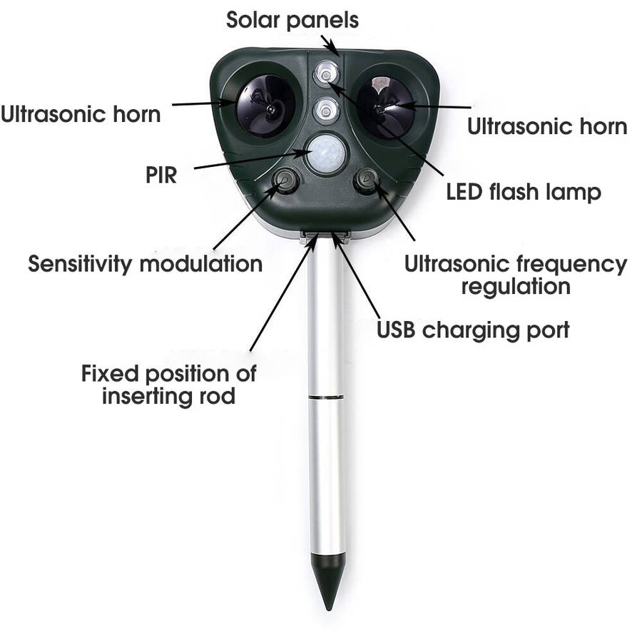 - Just to drive the animals without any chemicals, it just sends out the 15-65kHz ultrasound frequency to drive them away. It will not harm the human body.