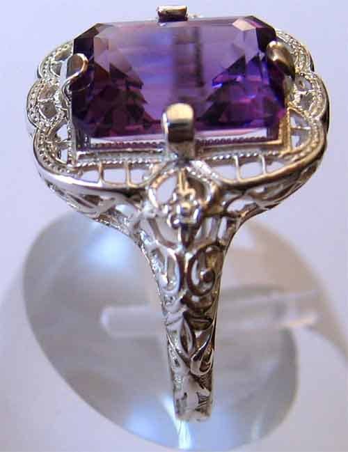 This pretty ring features one stone approx 10.00 x 8.00,mm emerald faceted cut Amethyst , total carat weight +- 2.98cts. - hand set in a beautifully detailed Sterling Silver mount .