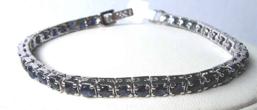 This well designed tennis bracelet is set in Sterling silver. Blue Sapphires are set in a a silver 925 mount which is stamped 925, weight 13.82 grams . The piece is 18.50cm long and fits the average sized wrist. It is in excellent condition and is finished with a fold over safety clasp. |