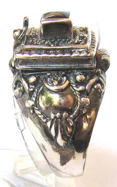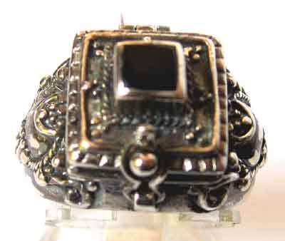 This is a very nice ornate sterling black onyx poison ring. The square- shaped onyx stone at the center of this ring is bezel set and surrounded by detailed work on the silver. It has a hinged compartment and the shoulders has more detailed work.