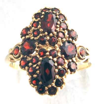 Genuine garnet ring hand set with 2 pieces of 5.00x 3.00mm oval facet garnets, 2pieces of 3.00 mm round cut garnets and 24 pieces of 2.00 mm round cut garnets, total weight approx.2.22 cts. All very good quality stones.Crafted in solid 9ct yellow gold this impressive and delightfully feminine ring is size;= " O ". Top of the ring |