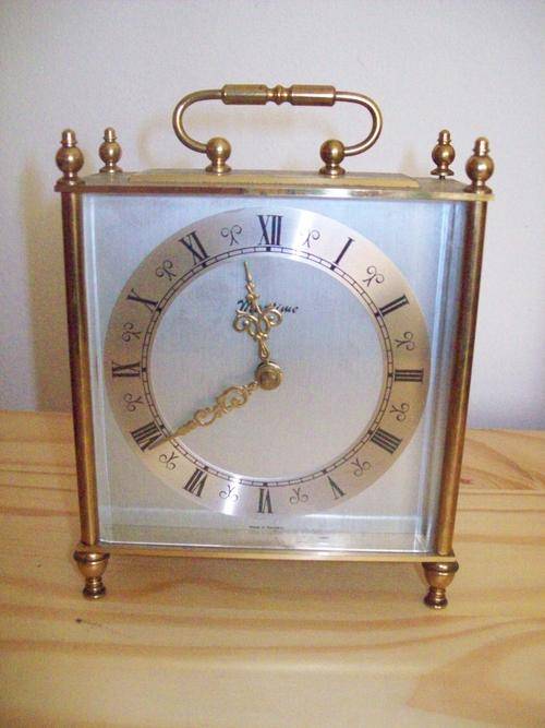 MARITIME Clock. Weighs 1kg. Height - 17.5cm; width - 14cm; depth - 5cm. Made in Germany. Handle on top to carry and feet under to stand on. Back opens to insert battery.
