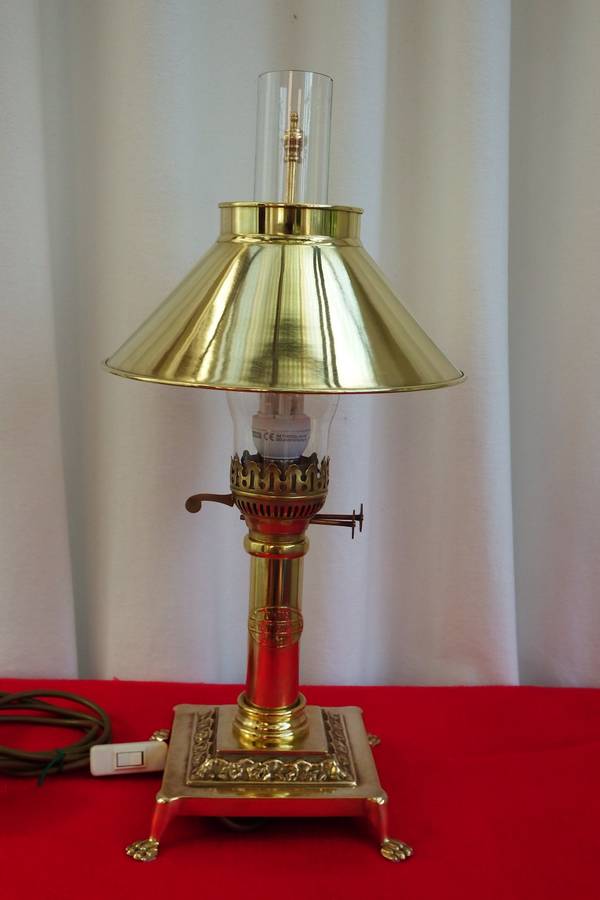 Marks/Observations: Makers name, W. Redman, made in England to be found on base of lamp. Converted to electricity. Look on the internet, and you will find numerous 'similar' lamps, all copies, and made originally in Taiwan. BUT, look carefully, and you will see they are brass plated and were made for electricity, having a switch to turn it on. You will see the plaque, stating "Paris to Istanbul" usually is painted with a green enamel and is pop-riveted to the lamp. The glass funnel is not heat-proof and the whole lamp, being brass plated, will show tarnish marks. The lamp offered above is in solid brass, the plaque is soldered into place and evidence of its original use as a paraffin lamp can be clearly seen, with the two levers (adjusters) for the wicks still in place, including the lever on the opposite side used originally to 'kill' the flame.