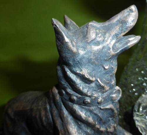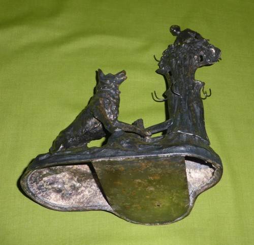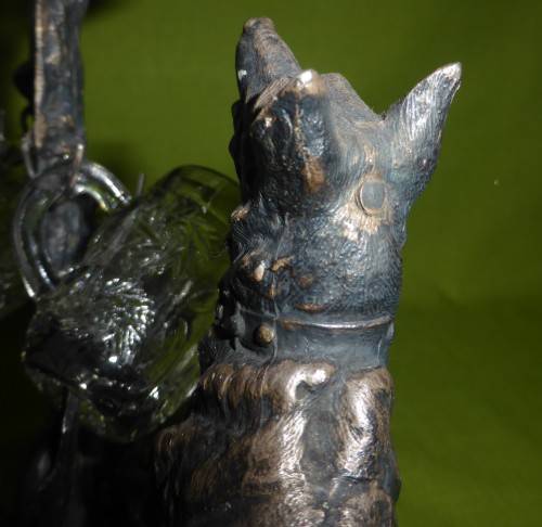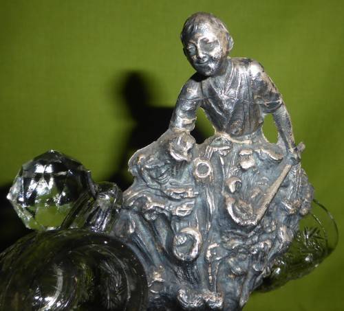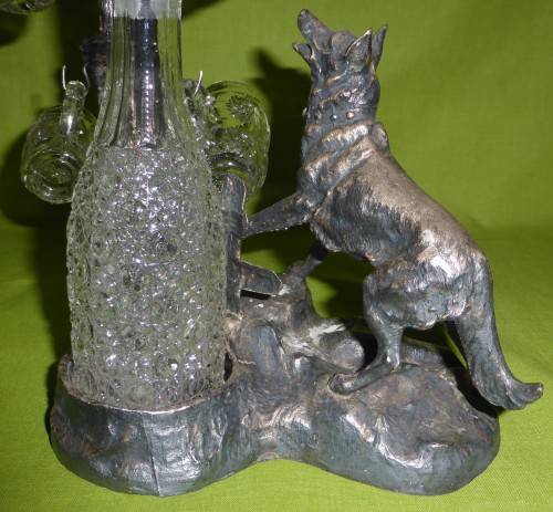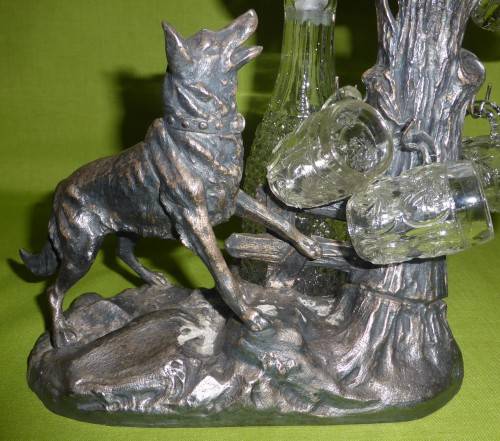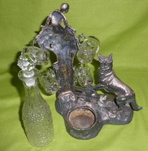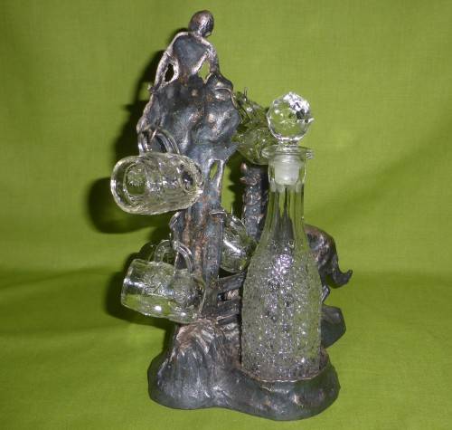 WHAT A GREAT ITEM FOR DISPLAY!!! The total weight is just over 1,4kg's! Solid iron and coated in some silver, copper and bronze colours. Looks like SPELTER, but it is very heavy! I believe too heavy for Spelter. It appears to be handmade. Some "handmade" imperfections, but SO MUCH CHARACTER!!! You can also see that the hooks for the shot glasses were handmade and also applied by hand - attached to the iron. Total piece size is around 23cm wide x 27cm high. The glass decanter, which stands at the back is in excellent condition. However, the shot glasses have some tiny chips. THIS IS ONE OF THOSE RARE PIECES!!!