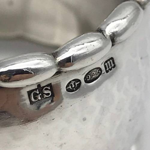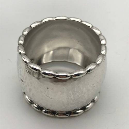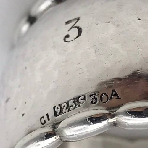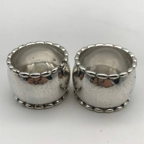 This super, rare set of four matching 'Georg Jensen' sterling silver napkin rings were made in Denmark around the 1920's and exported to London. The napkin rings have a simple convex shaped body with a soft, hand-hammered finish, with stylish beaded edges. They are also stamped with the London silver import mark for 1927 and 'G.S.' for the importers agent 'George Stockwell'. Along with those hallmarks is the 'GI' '925S' and shape number '30A' hallmarks. Each one is impressed with a small number, from '1' to '4', and are all in great condition. They each have a diameter of 4cm, stand 3cm high and together weigh 99,7g.