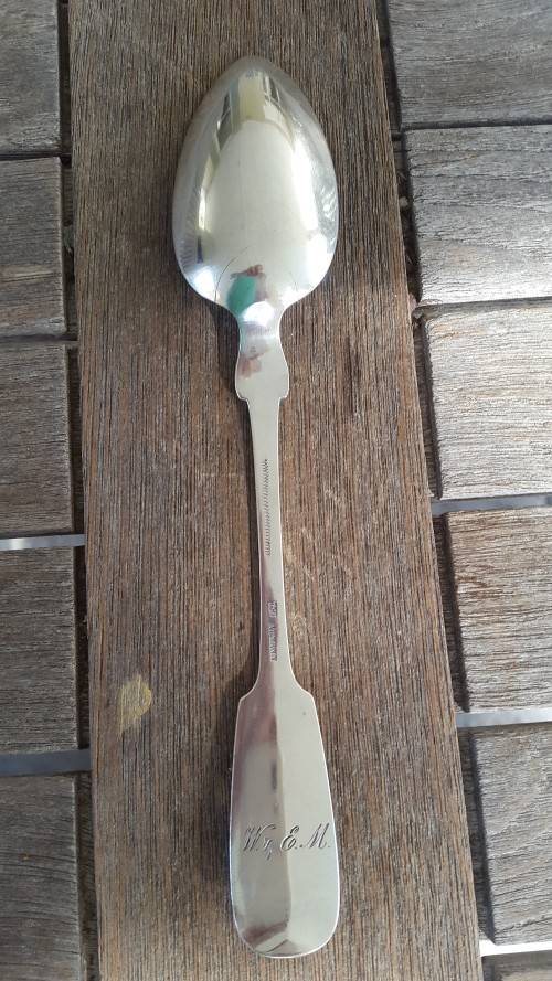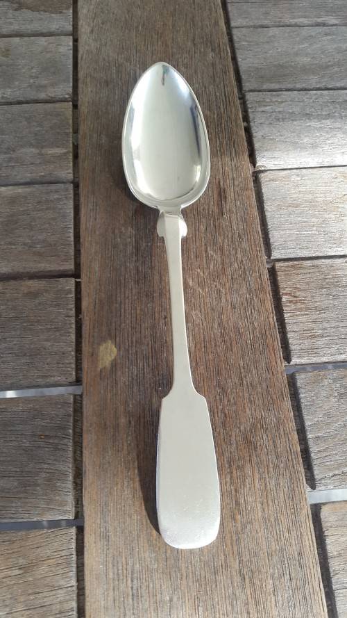 This is a beautiful old solid silver serving spoon from Germany with an elegant fiddleback handle.