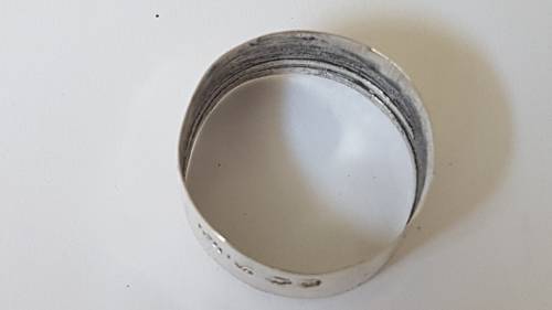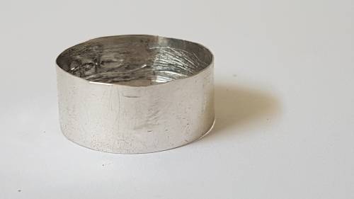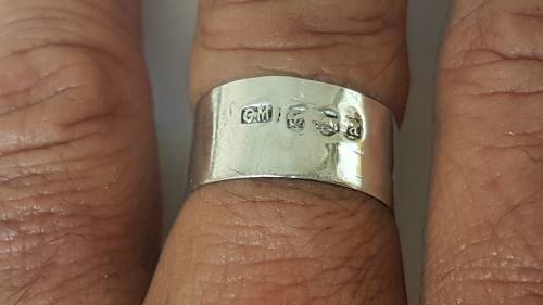 New , never worn. Made from a vintage old silver bottle lid with hallmark on the outside. Comfort fit. The insde has been smoothed for comfort but there are still traces of the old grooves of the bottle lid.