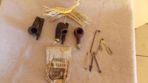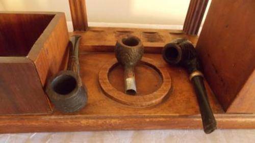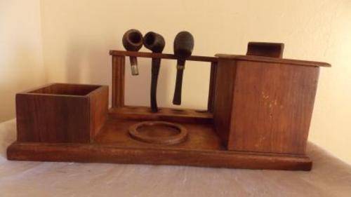 SOLID WOOD PIPE AND ACCESSORY STAND. (3 PIPES AND PIPE CLEANERS INCLUDED) HEIGHT 15cm, LENGTH 40.5cm WIDTH 19.5cm. SHIPPING COSTS R55.00