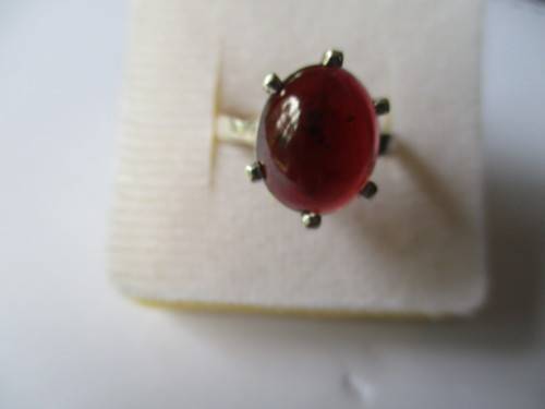 The ring is size " M " set with 11.00 x 9.00 mm oval cut garnet, weight 4.81 ct. ,