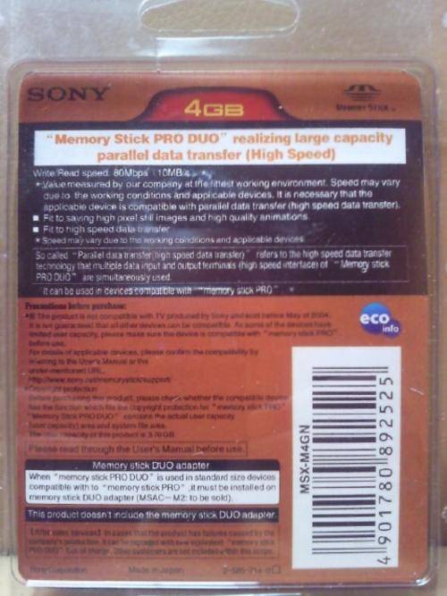With a 4GB memory capacity, the compact Sony Memory Stick PRO-Duo™ media card is the perfect solution for storing and transferring high resolution video and still photos recorded on compatible Handycam® camcorders and Cyber-shot® digital cameras and much, much more. Capable of up to 80 Mbps data transfer the Memory Stick is designed to make your multimedia experience as efficient as possible.