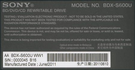 The drive Sony sent us for this review was manufactured in June of 2011 and had firmware 1.D0. This is the newest firmware currently available for the BDX-S600U.