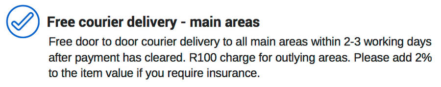 R35.00 Standard shipping using one of our trusted couriers applies to most areas in South Africa. Some areas may attract a R30.00 surcharge. This will be calculated at checkout if applicable.