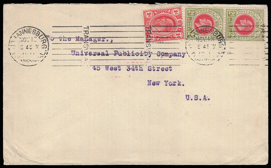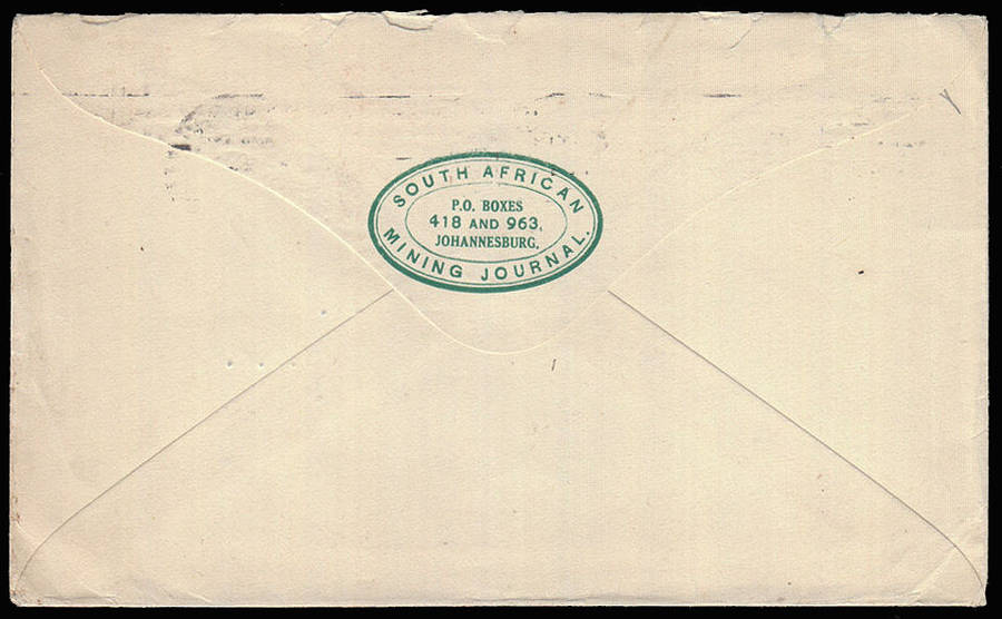 Addressed to USA with fine South African Mining Journal imprint on reverse. Clean lot