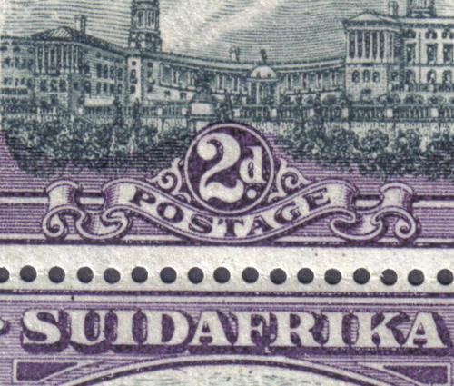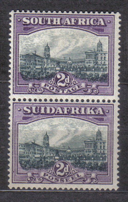 A SUPERB pair of Vertical stamps Very light mounted mint showing the Variety broken "T" in Postage, plus the Violet dot above the "u" of SUIDAFRIKA Top stamp.
