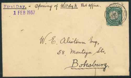 Interesting South African Cover Cancelled with an Opening of Witdyk Post Office First Day Postmark dated the 1st of February 1937. The Cover is a bit tatty.
