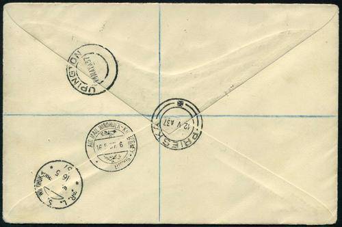 Interesting South Africa 1937 KGVI Coronation First Day Cover which was flown from Prieska via Kimberley to Windhoek in South West Africa on the 12th of May 1937. The FDC is backstamped with an In Transit "Upington" Postmark dated the 14th of May 1937 , an "Air Mail - Windhoek - Kimberley" Flight Cachet dated the 16th of May 1937 and with a Scarce arrival "R.L.S. Windhuk" Postmark dated the 16th of May 1937. Putzel Lists this Postmark as B14a and states that the Canceller is a Converted German Canceller from the old "Fahlgras Bez - Windhoek" Canceller.