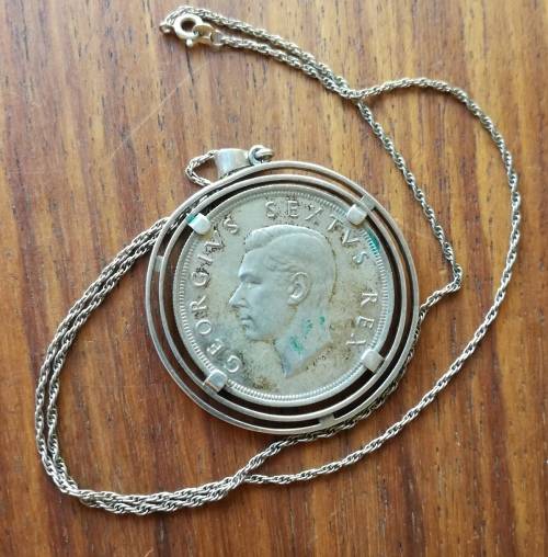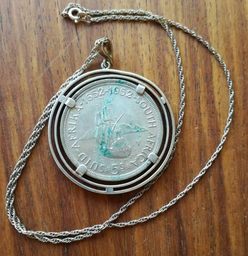 South Africa 1952 silver 5 Shillings in silver pendant with chain. South Africa 1952 silver 5 Shillings in silver pendant with chain.