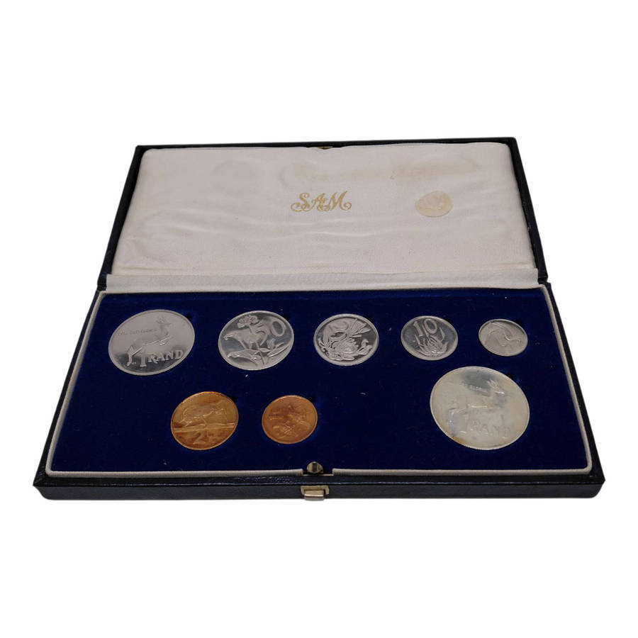 The 1984 South African Short Proof Set contains the full range of circulation denominations issued that year, struck to proof quality by the South African Mint. Proof coins are specially struck to produce a mirror-like finish and sharp relief, appealing to collectors seeking high-quality examples of modern South African coinage.