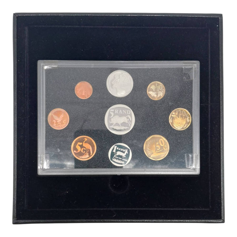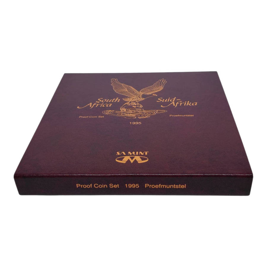 The 1995 South African Proof Coin Set, issued by the South African Mint, includes the full range of circulation denominations in premium proof quality. Each coin is struck with frosted devices and mirror-like fields, showcasing the Mints precision and craftsmanship.).
