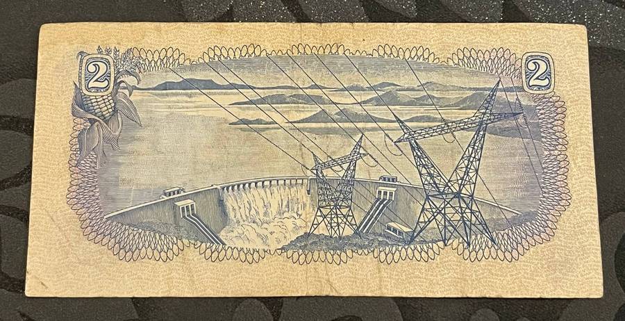 Original South African Reserve Bank 2 Rand note featuring Jan van Riebeeck on the obverse and the hydroelectric dam and power lines on the reverse.