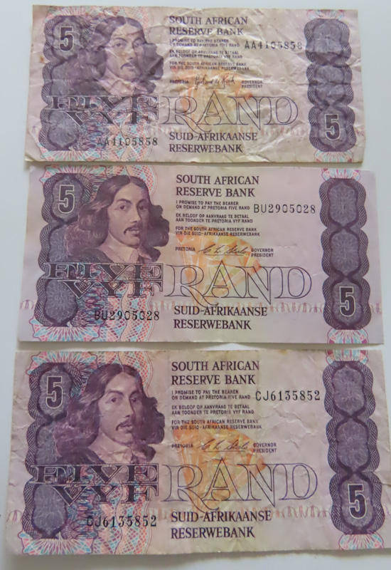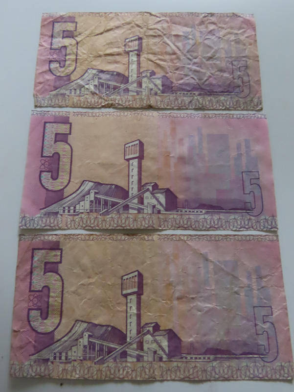 Here we have South Africa - 3 South Africa R5 Notes 2 of Stals and 1 De Kock