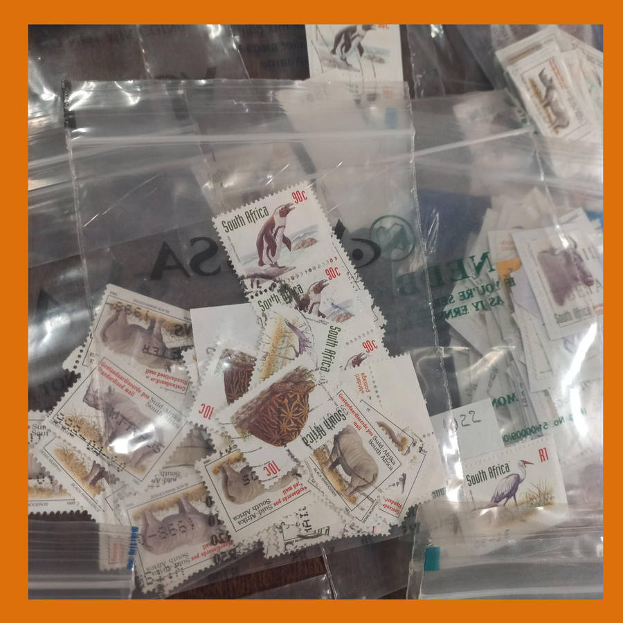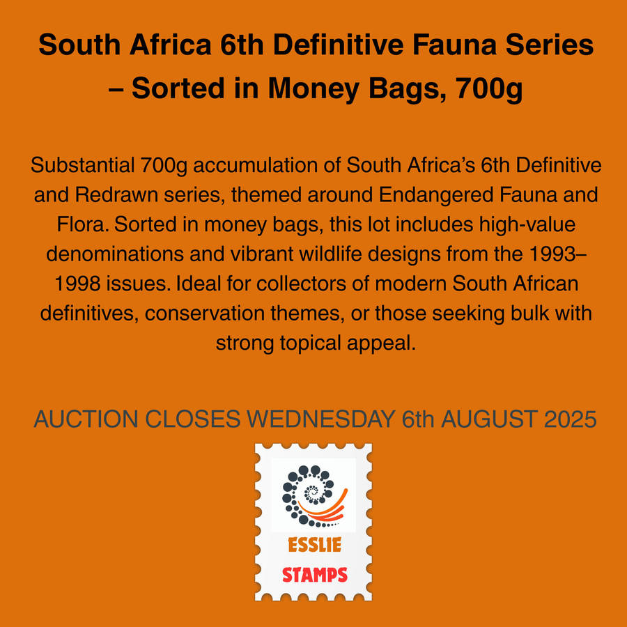 Substantial 700g accumulation of South Africas 6th Definitive and Redrawn series, themed around Endangered Fauna and Flora. Sorted in money bags, this lot includes high-value denominations and vibrant wildlife designs from the 19931998 issues. Ideal for collectors of modern South African definitives, conservation themes, or those seeking bulk with strong topical appeal.