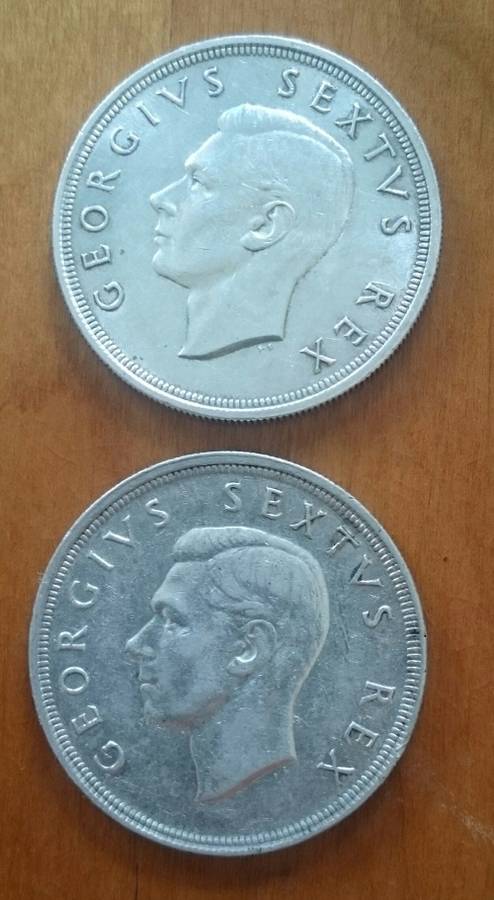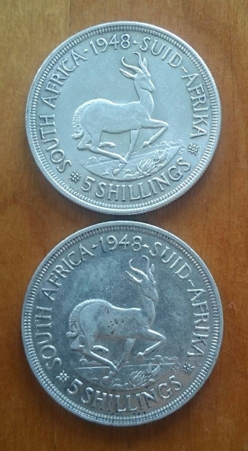 South Africa 80% silver 1948 5 shillings x 2 in good condition.