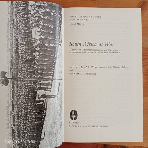 "South Africa at War not only graphically describes the deadly battles waged against U-boats in South African waters, but it is also unique in that it deals also with the enormous effort by thousands of men and women who were not in the forces at all but nevertheless shared the anxieties, the hardships and the triumphs inseparable from years of armed conflict ending in victory. Problems which could well arise again, and efforts at solving them are dealt with candidly and no effort has been made to cover up South Africa's shortage of manpower, her divided loyalties and the military difficulties arising from racial policies as they existed during the war years.". PLEASE CHECK IMAGES FOR CONDITION