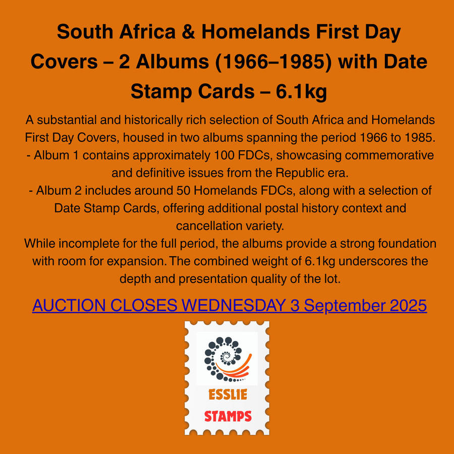 TAGS: South Africa FDCs, Homelands First Day Covers, Date Stamp Cards, RSA postal history, 19661985 stamps, addressed covers, commemorative stamps, definitive stamps, African philately, stamp albums, historical covers, incomplete collection, philatelic expansion, postal cancellations, stamp presentation, South African Homelands, stamp archive, 6.1kg stamp lot, collectors albums, regional philately