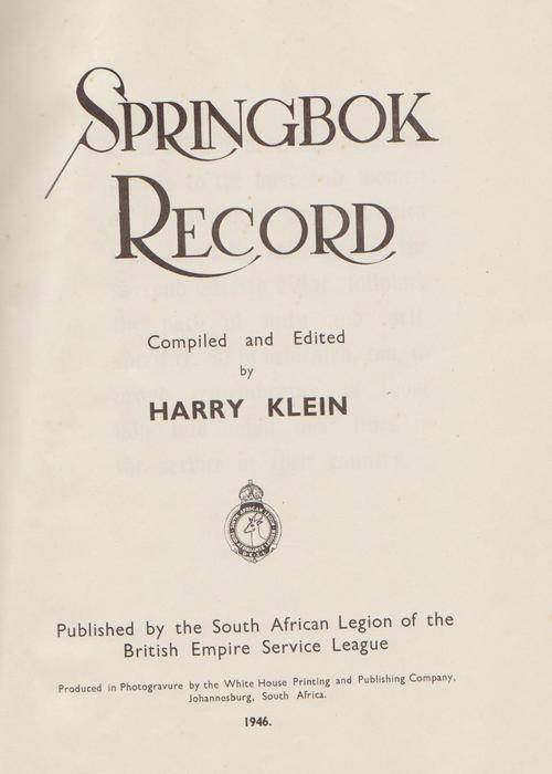 South Africa In World War 2 - Springbok Record By Harry Klein, published in 1946 By The South African Legion Of The British Empire Service League, 304 pages, larger hardcover with no dustjacket, slight scuffing etc and the slightest of age spots on some pages otherwise all good.
