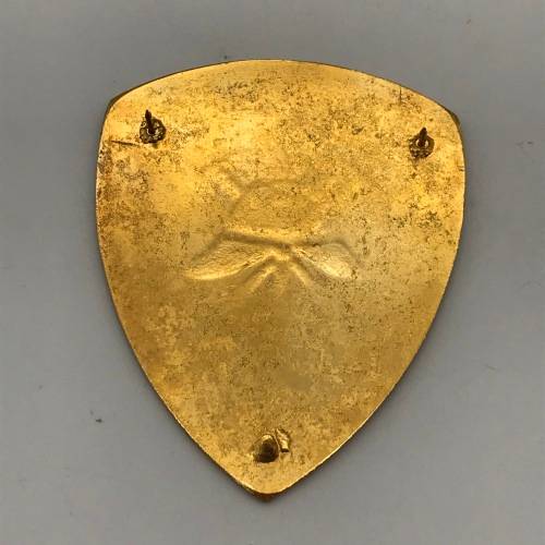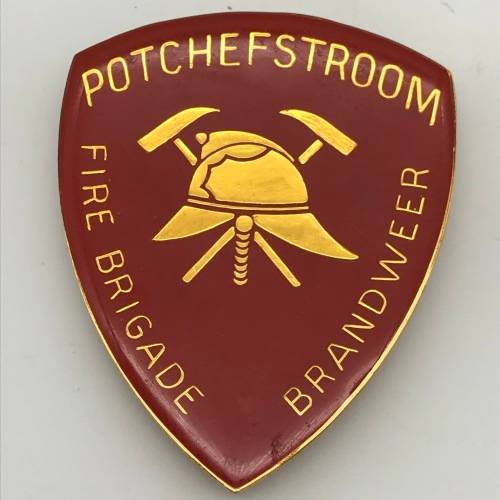 This early, large, metal, red and gold enamel shoulder flash of the Potchefstroom Fire Brigade, with 3 pins intact, is in excellent condition. It measurs 8.2cm x 6.7cm.