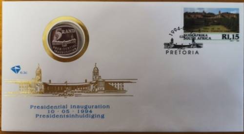 SOUTH AFRICA R5 COIN on FDC- 1994 MANDELA PRESIDENTIAL INAUGURATION