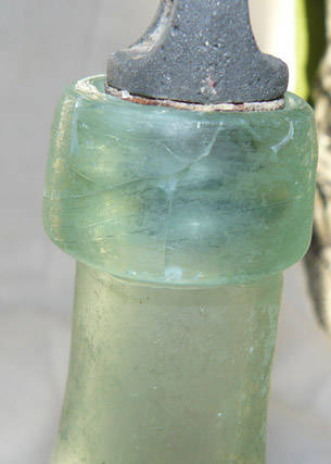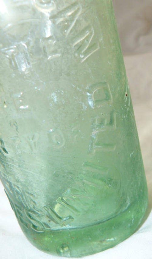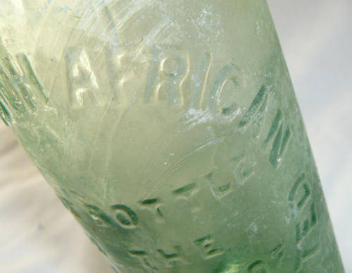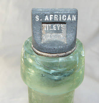 This is the typical SA Breweries 0.5 pint bottle from the late 1890s or very early 1900s, but what makes it very unusual is that it is in aqua glass instead of the normal dark green or olive colour. The bottle is 24cm in height and has the normal Riley's chisel stopper in black ebonite. It is in good condition, with some internal "crackling" in the lip.