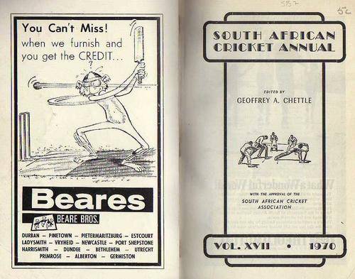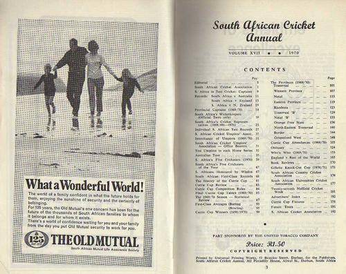 Soft cover book featuring the 1970 Australian Tour, Five Cricketers of 1970, THE CURRIE CUP TOURNAMENT(1969-1970); WHO'S WHO IN SOUTH AFRICAN CRICKET , THE GILETTE CUP (1970-1971); FIRST CLASS - TEST - CURRIE CUP RECORDS, UNIVERSITIES, NUFFIELD AND COUNTRY DISTRICTS CRICKET! Book is in a neat condition.