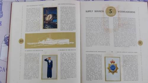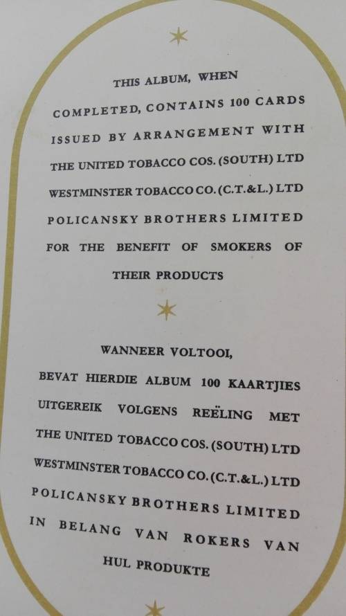 A cigarette card album containing 100 cards ( complete and all intact) on various Units of the SA Defence Force through history, issued by arrangement with the United Tobacco Cos ( South ) Ltd ; Westminster Tobacco Co Ltd. , Policansky Brothers Limited for the benefit of smokers of their Products , in English and Afrikaans.