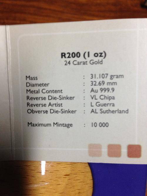 A pure gold 1 oz coin, with the denomination of R200. The obverse depicts the South African coat-of-arms with the words “South Africa” and the year “2010”.