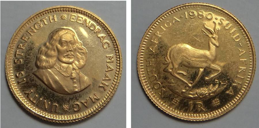 On the following gold proof R1 of 1980 (see the picture at the bottom), the CLS (Coert Steynberg) initials are totally absent as is virtually all of the Karoo skyline.