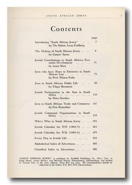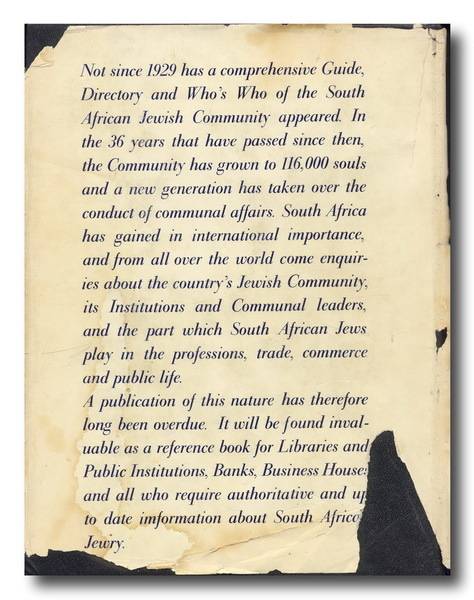 South African Jewry 1965 edited by Leon Feldberg. A4, hard cover with dust cover, 512 pages. Dust cover quite worn and stained. Book inside in good condition.