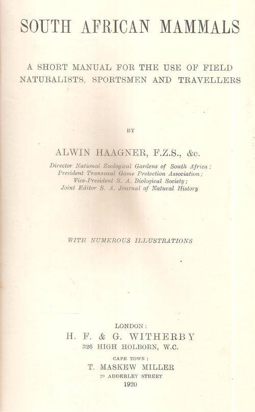 South African Mammals By: Alwin Haagner, F.Z.S.,