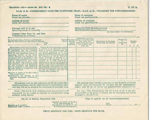SOUTH AFRICAN RAILWAYS "CONSIGNMENT NOTE", 1953.