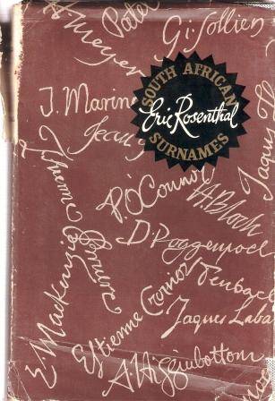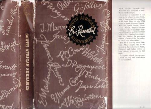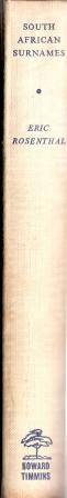 Rosenthal Eric. South African Surnames. Cape Town: Howard Timmins, 1965. 1st. This book describes over 2500 South African names. A small name-inscription on frontcover and on endpaper. Minor foxing on endpapers. Dw. is fairly worn with tears, but mostly intact. Binding is neat and tight. 140x220mm Tall. Good in Fair dust-jacket. Papercovered Boards.