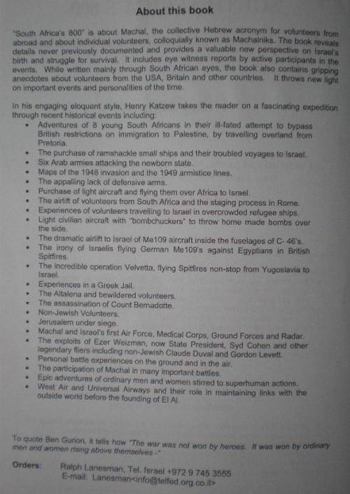 SOUTH AFRICA'S 800-THE STORY OF SOUTH AFRICAN VOLUNTEERS IN ISRAEL'S WAR OF BIRTH BY HENRY KATZEW-THIS BOOK REVEALS DETAILS NEVER PREVIOUSLY DOCUMENTED-PUBLISHED 2003-STIFF CARD COVER 382 PAGES-ILLUSTRATED-CONDITION VERY GOOD-9/10