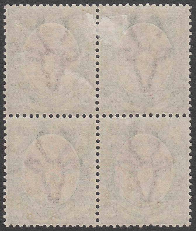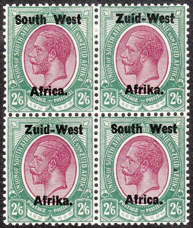South West Africa 1923 Kings Heads Type I: 2/6d block of 4 very fine mint, top pair LMM, bottom pair MNH. The black spot on bottom right stamp appears to be similar ink as the overprints. Condition as per scans.