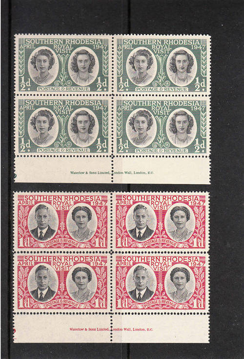 SOUTHERN RHODESIA: SG 62-63: Royal Visit set of 2 imprint blocks of 4. Issued 1.4.1947. Unmounted mint (**). Please contact me if any further information is required. You will receive the item shown in the image.